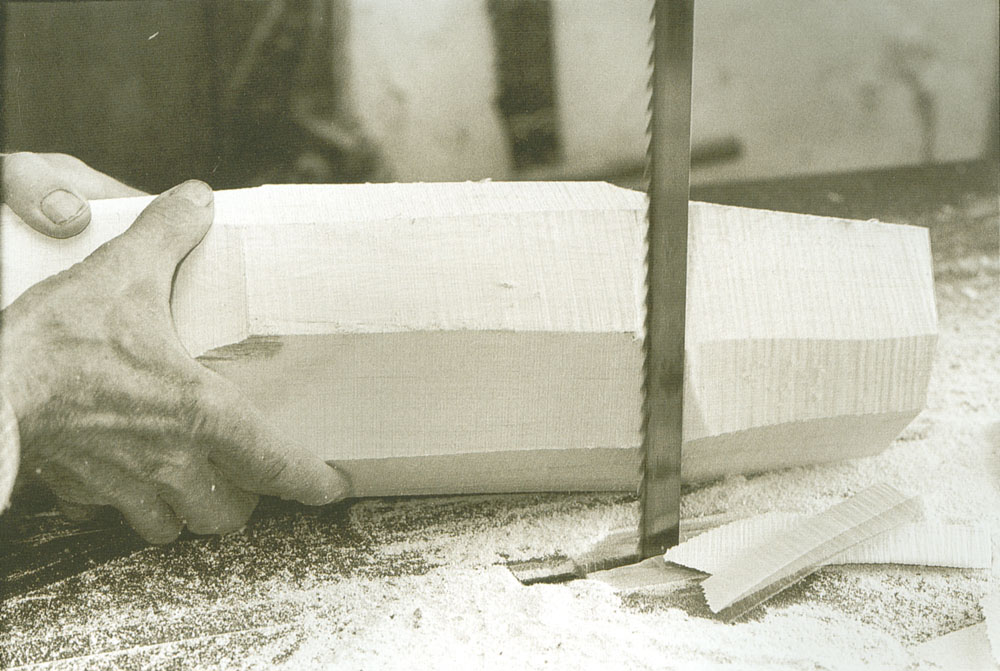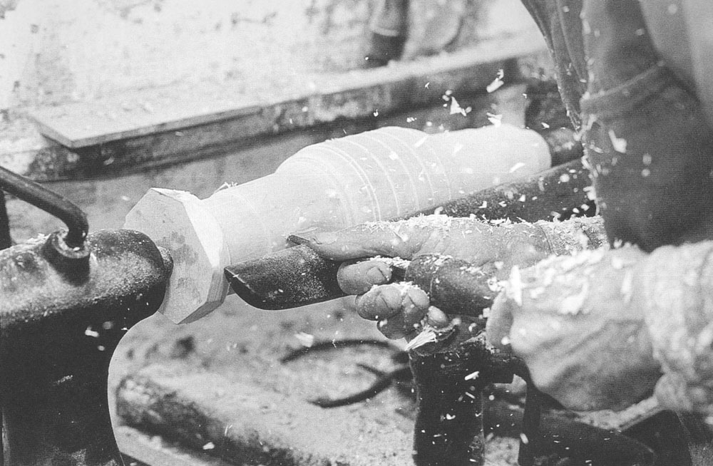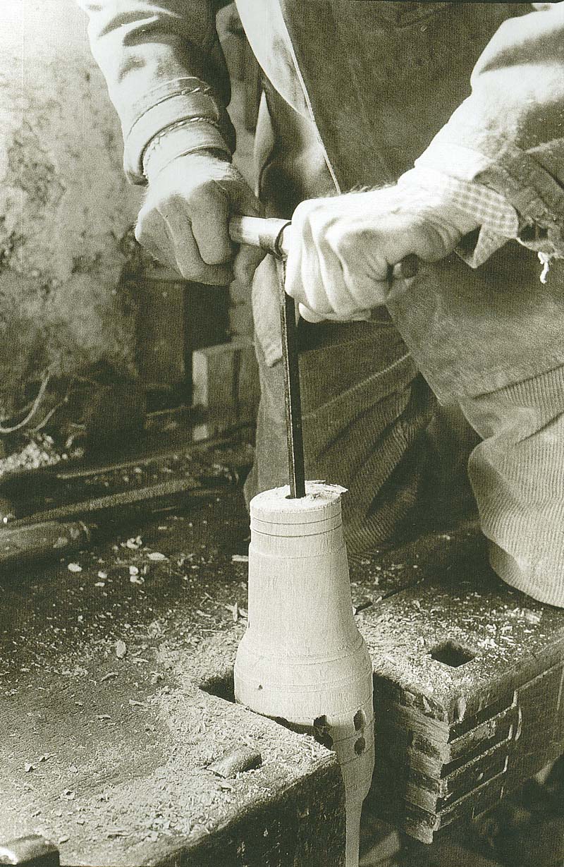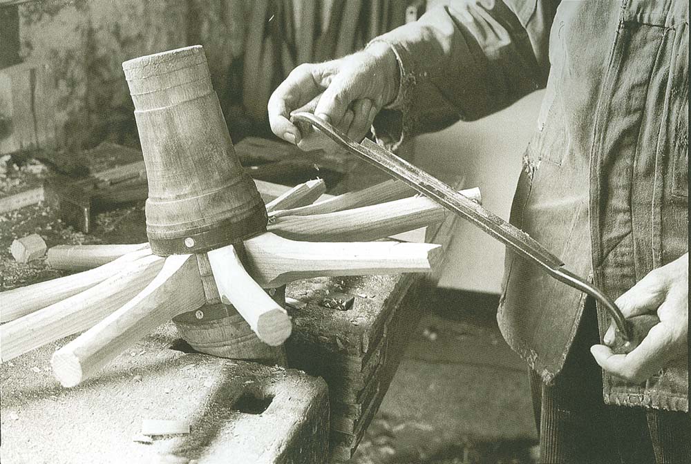 Speichen mit Hilfe von Bandsäge, Drehbank, Nabenbohrer, Stemm- und