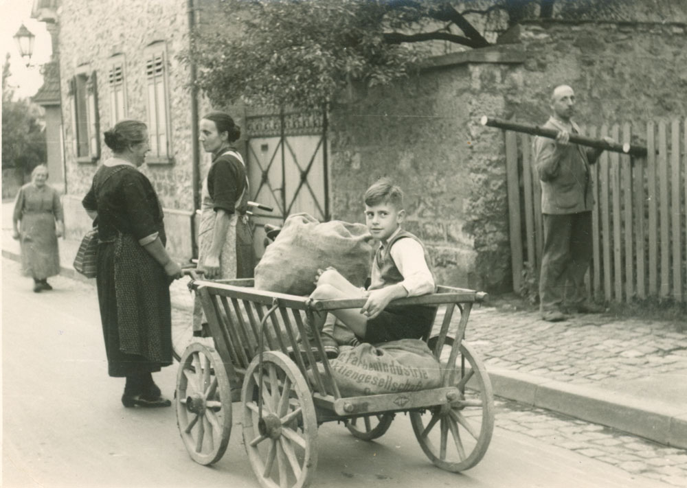 mit ihrem Sohn Helmut auf dem Handwagen. |