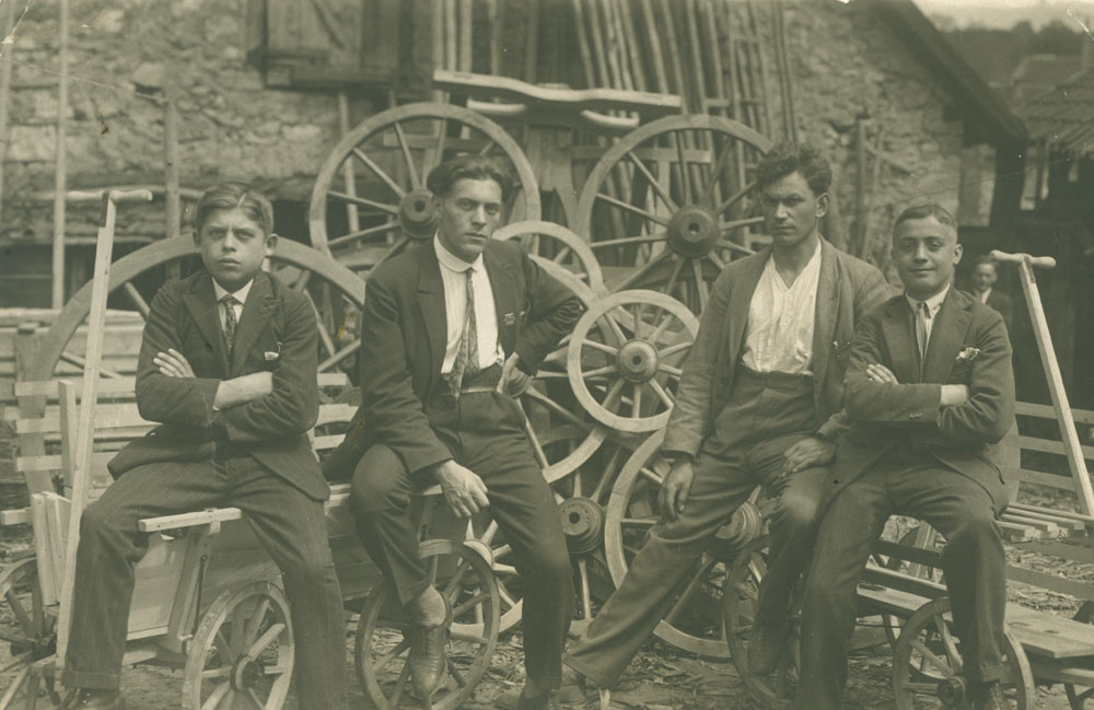 Wagnermeister Hans Appel mit Gesellen vor der Werkstatt im Oberdorf. |
