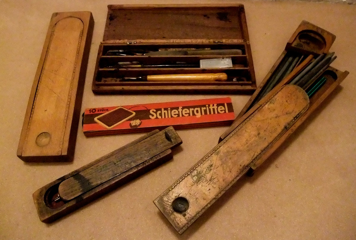 5 originale Griffelkästen mit altem Inhalt aus 5 Jahrzehnten Schülerdasein |