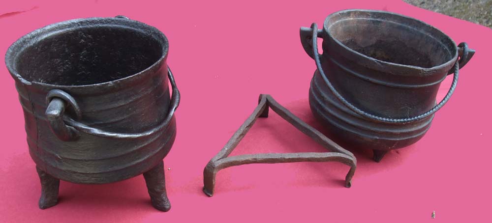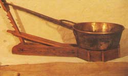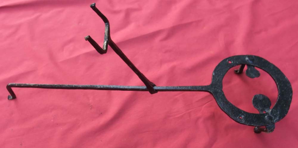 Bescheiden war das Mobiliar auf dem erst fest gestampften, später mit Natursteinplatten ausgelegten und dann geplätteten Boden. Ein einfacher Tisch, eine Holzbank oder schlichte Brettstühle, die Eimerbank und offene Regale für die Schüsseln genügten. Verschließbare Schränke gab es in diesem verrußten Umfeld noch nicht. Die irdenen Töpfe aus den Töpfereien der Region oder gusseiserne “Dreibeine”, Grapen, standen in der offenen Flamme oder hingen mit ihrem Metallbügel an einer Kette (oder zunehmend an der verstellbaren Kaminsäge) im offenen Rauchabzug. In diesen Töpfen wurde gekocht, ein Hinweis, dass die Speisen nicht getrennt zubereitet wurden, sondern Suppen, Brei oder eben Eintopfgerichte die Regel waren. Das seltene Fleisch wurde in Brocken geschnitten mit gekocht. Pfannen gab es in diesen einfachen Küchen eher nicht und dort, wo ein sog. Pfannenknecht ins offene Feuer gestellt werden konnte, gab es jetzt Töpfe mit flachem Boden, ein wirklicher Fortschritt. Da in der Regel nicht von Tellern gegessen wurde, kam der Topf auf die Mitte des Tischs und jeder schlabberte sich mit dem eigenen Löffel (Messer und Gabeln waren überflüssig) die Suppe aus dem gemeinsamen Topf, so dass sich auf dem Holztisch zwischen Topf und Sitzplatz eine verräterische Spur zu jedem Esser zeigte. Damit die Suppe bis zum letzten Rest gut auszulöffeln war, wurde der hier vorgestellte Untersatz, der hochgestellt werden konnte, eingesetzt. | ||||||||||||
