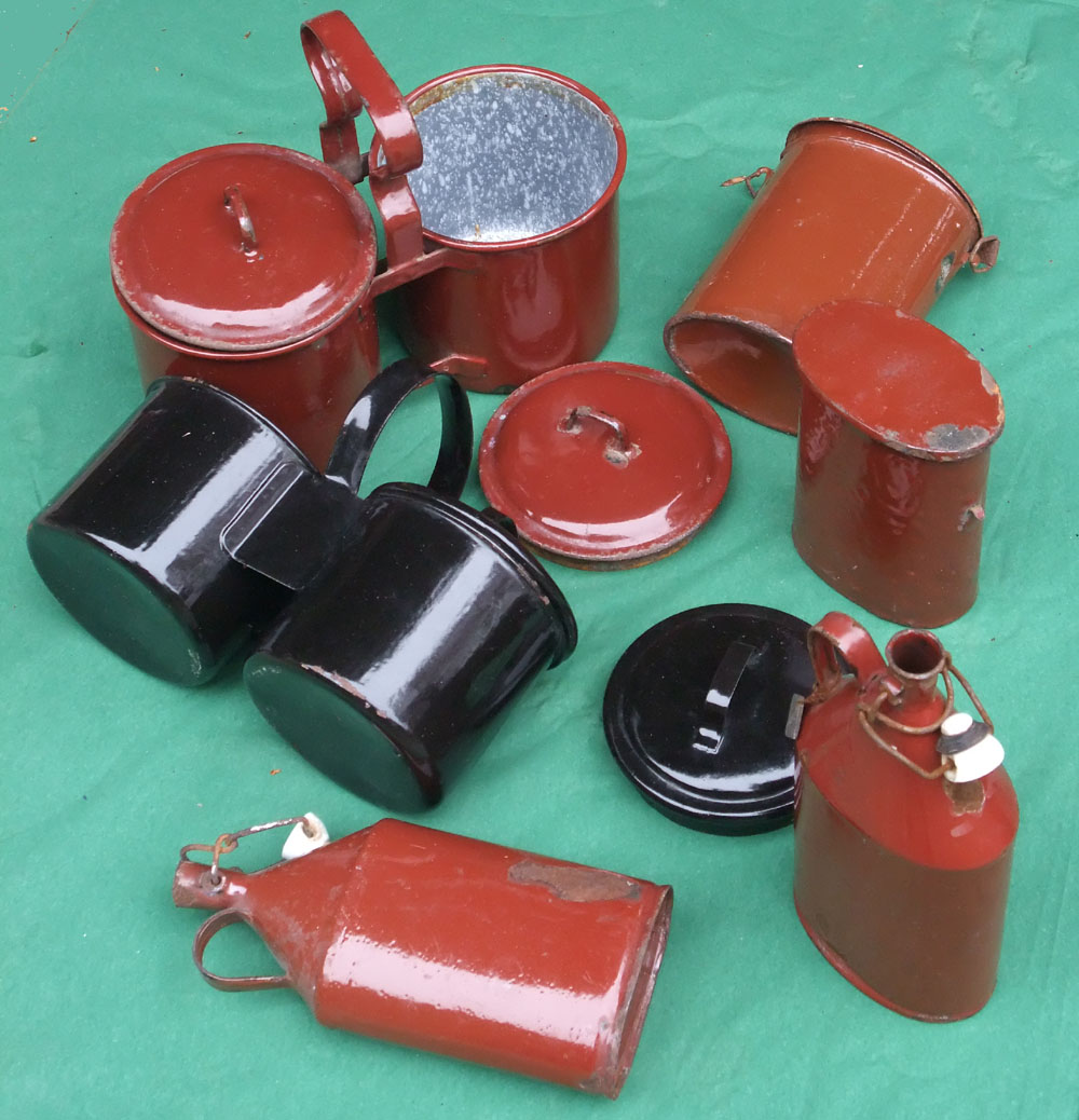 Emailletöpfe, deren Deckel mit einem Blechbügel abgesichert